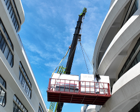 吊裝平臺(tái)猶如一位高空舞者,在起重機(jī)的牽引下緩緩上升。這個(gè)龐然大物的每一次移動(dòng),都需要施工人員像繡花一樣精細(xì)操作。手拉葫蘆的每一次拉動(dòng),吊裝帶的每一次調(diào)整,都關(guān)乎著整個(gè)作業(yè)的安全。施工人員必須像外科醫(yī)生一樣專注,既要確保平臺(tái)平穩(wěn)上升,又要防止與建筑物發(fā)生碰撞。